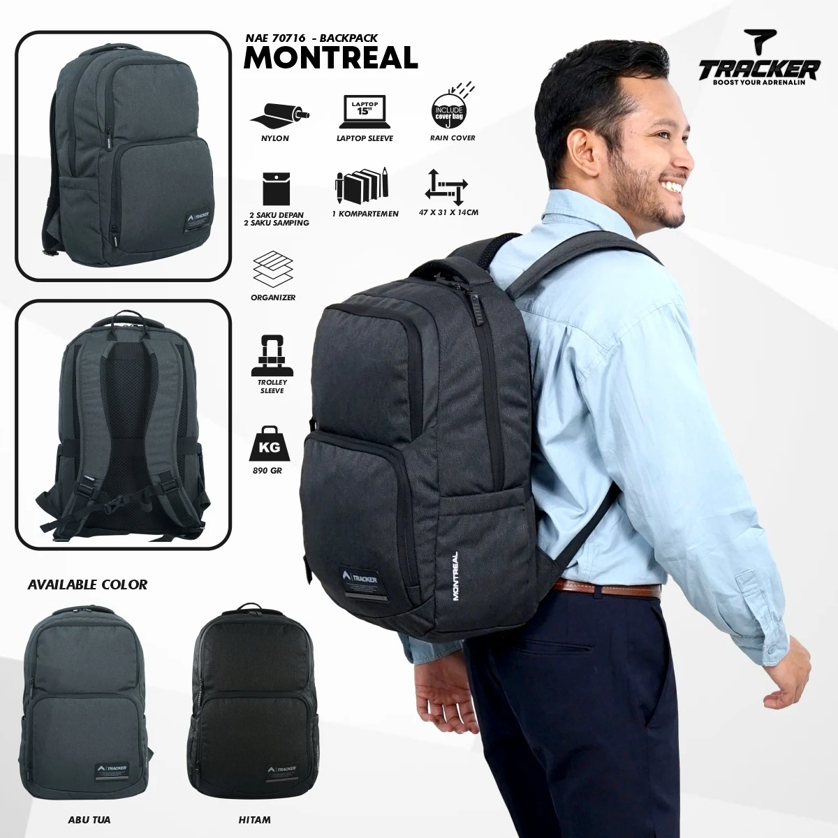 Ransel Montreal cocok digunakan untuk kegiatan sehari-hari.Dilengkapi kompartement utama dan kompartement tambahan seperti saku depan, organizer, dan saku samping. Ransel Montreal siap menemani kegiatan Trackermate😊