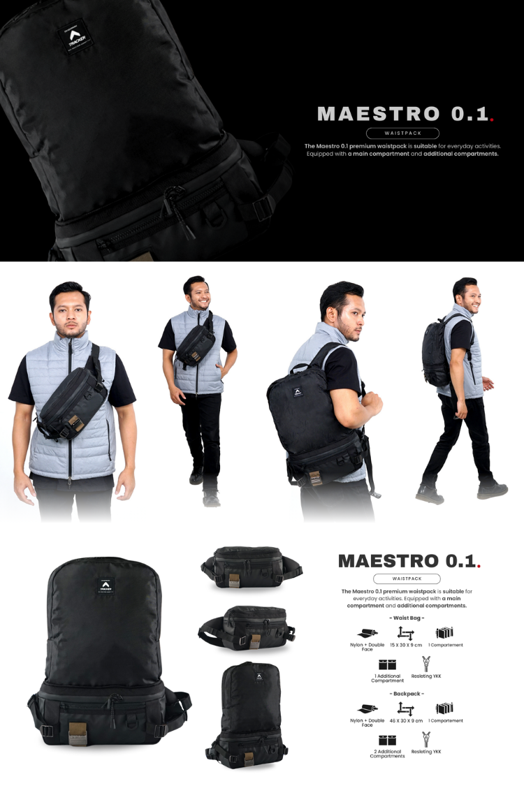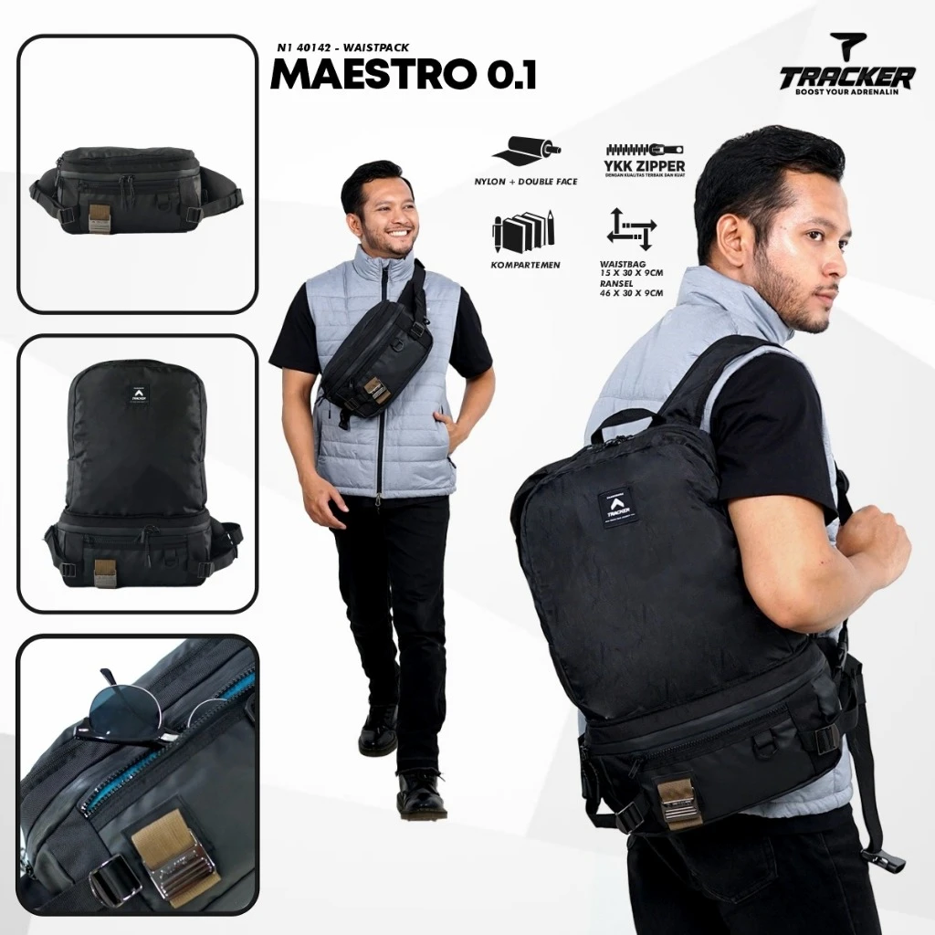 Tas Ransel Travel Mulltifungsi Pria Tracker Maestro sebuah waistbag yang bisa menjadi ransel. Tas Ransel Travel Mulltifungsi Pria Tracker Waispack Maestro cocok digunakan untuk kegiatan sehari-hari.Dengan memiliki dua fungsi pemakaian yang dapat dipakai sebagai backpack dan dapat dipakai sebagai waistbag. Dan siap menemani petualangan Trackernity.